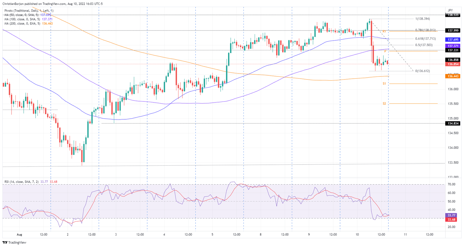 Short-term, the EUR/JPY hourly chart, illustrates the pair as neutral-upwards, but prices falling below the weekly opening price of 137.32, might pave the way for further losses. The downtrend seems to lose steam as the Relative Strength Index (RSI) entered oversold conditions, which means that the EUR/JPY might print a leg-up towards the 50% Fibonacci retracement at 137.50 before resuming the downtrend.