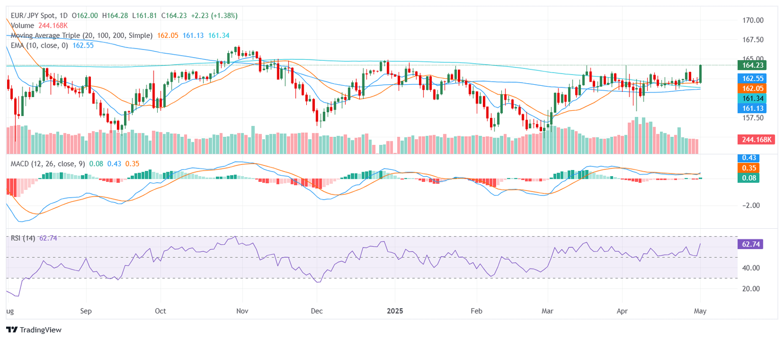 The EUR/JPY pair extended its rally on Thursday, pushing toward the 164.00 zone after a strong advance during the European session. The pair sits near the top of the day’s range as it enters the Asian session, reflecting sustained demand despite a flattening in momentum indicators. While some short-term tools remain neutral, the overall technical structure leans decisively bullish, backed by a solid base of upward-trending averages.