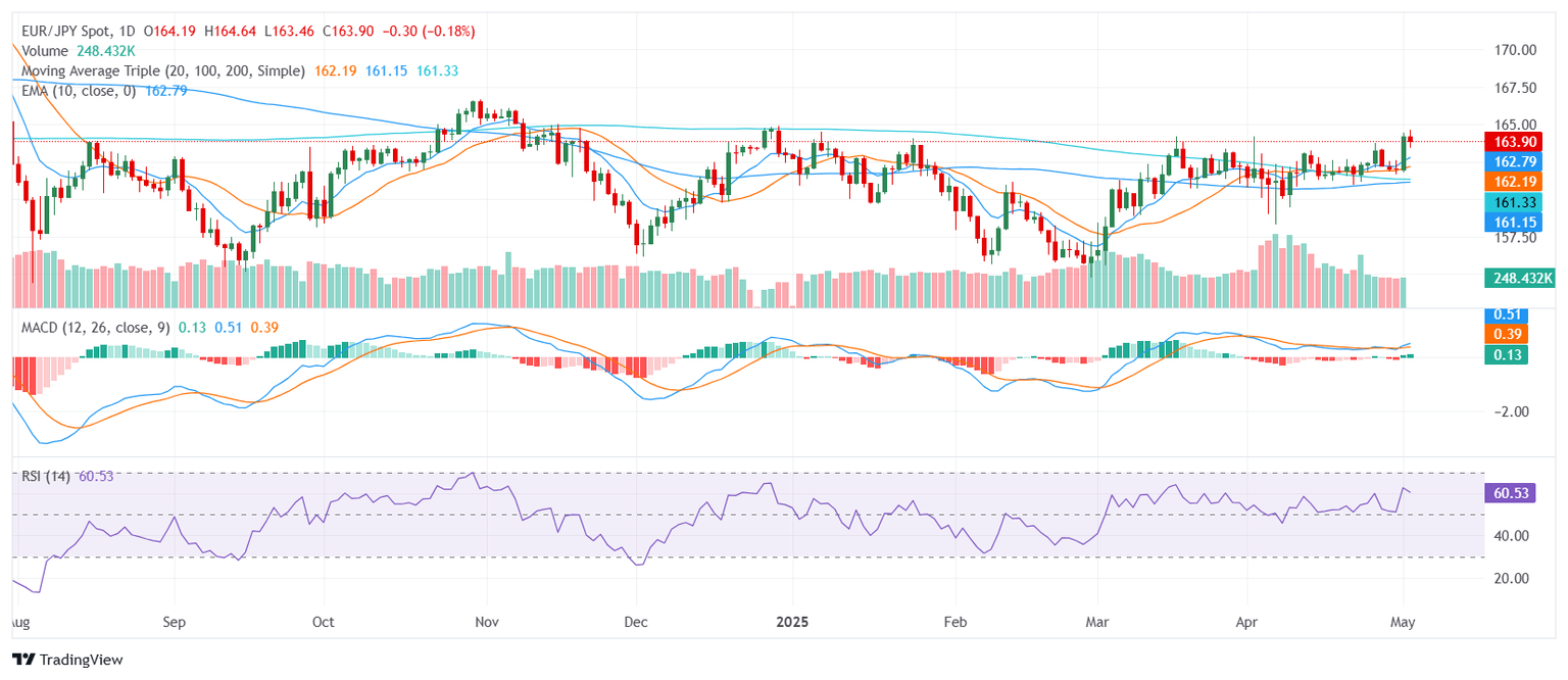 The EUR/JPY pair edged slightly lower on Friday but continues to trade near the 164.00 zone as the market transitions into the Asian session. While price action eased from recent highs, the pair remains comfortably within the mid-range of the day’s movement. The pullback hasn’t altered the broader bullish outlook, which is supported by rising trend-based indicators across multiple timeframes.