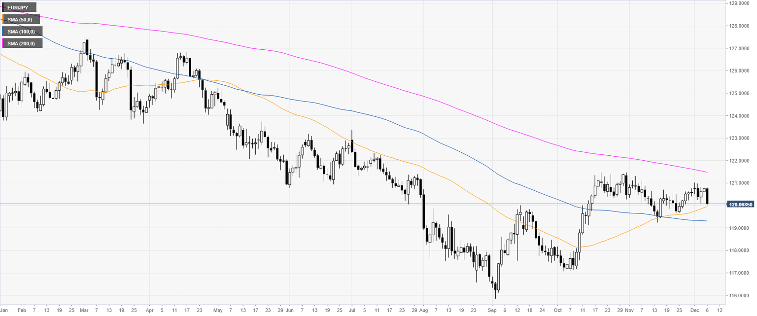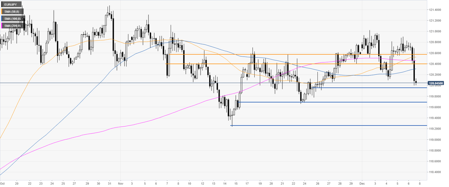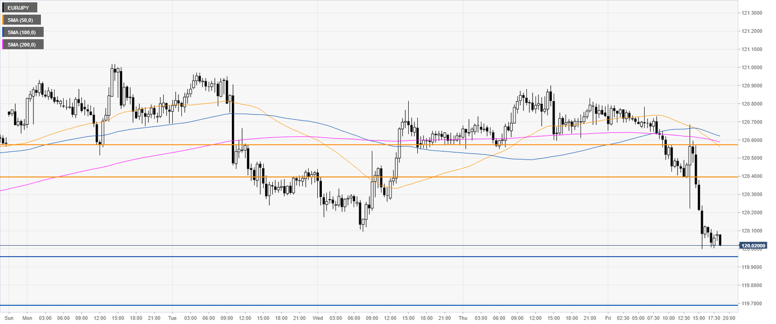 EUR/JPY price analysis: Euro drops against yen, trades near 120.00 handle