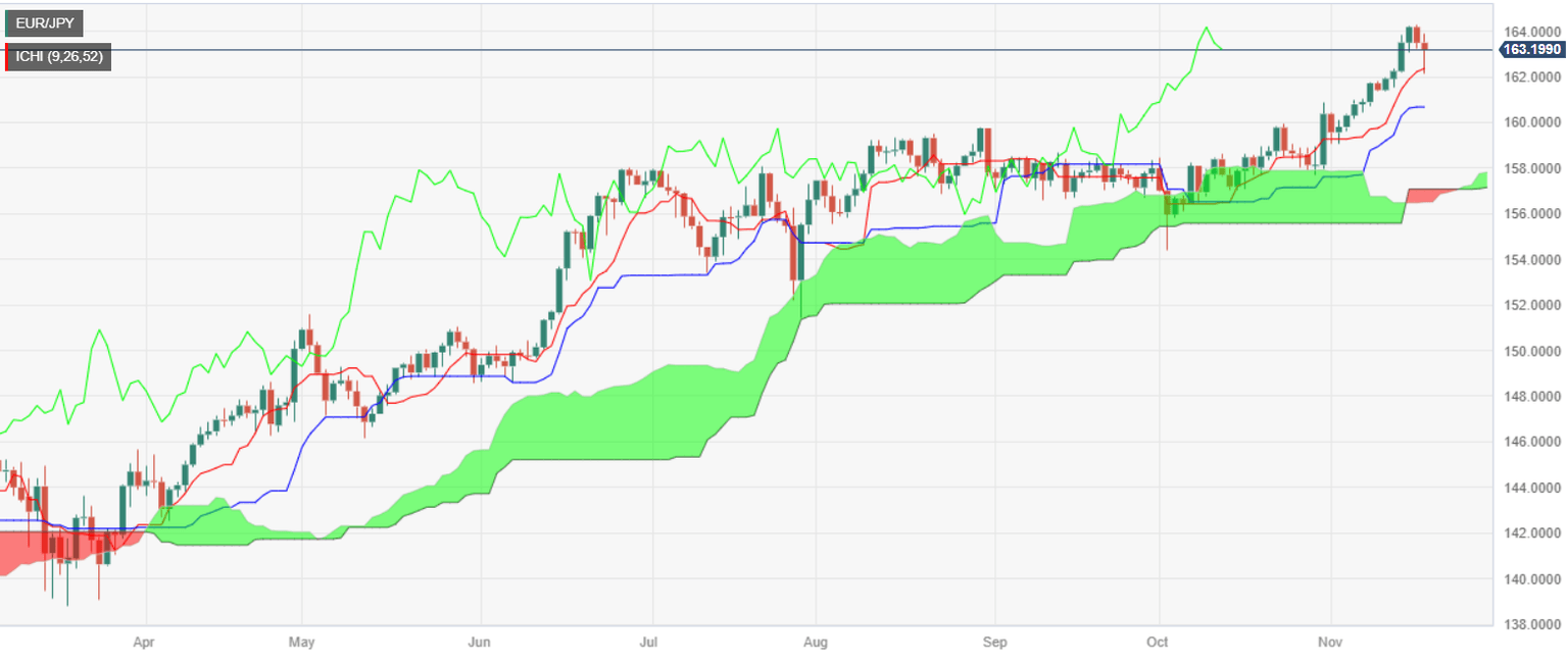If EUR/JPY climbs above the 164.00 figure, that could open the door to challenge the year-to-date (YTD) high of 164.31, ahead of the 165.00 mark. On the other hand, if sellers step in and pull prices below the 163.00 figure, a dive toward the day’s low of 162.15, is on the cards. Up next, the pair could drop to 162.00, followed by the Senkou Span A at 161.51, ahead of sliding toward the Kijun-Sen at 160.65.