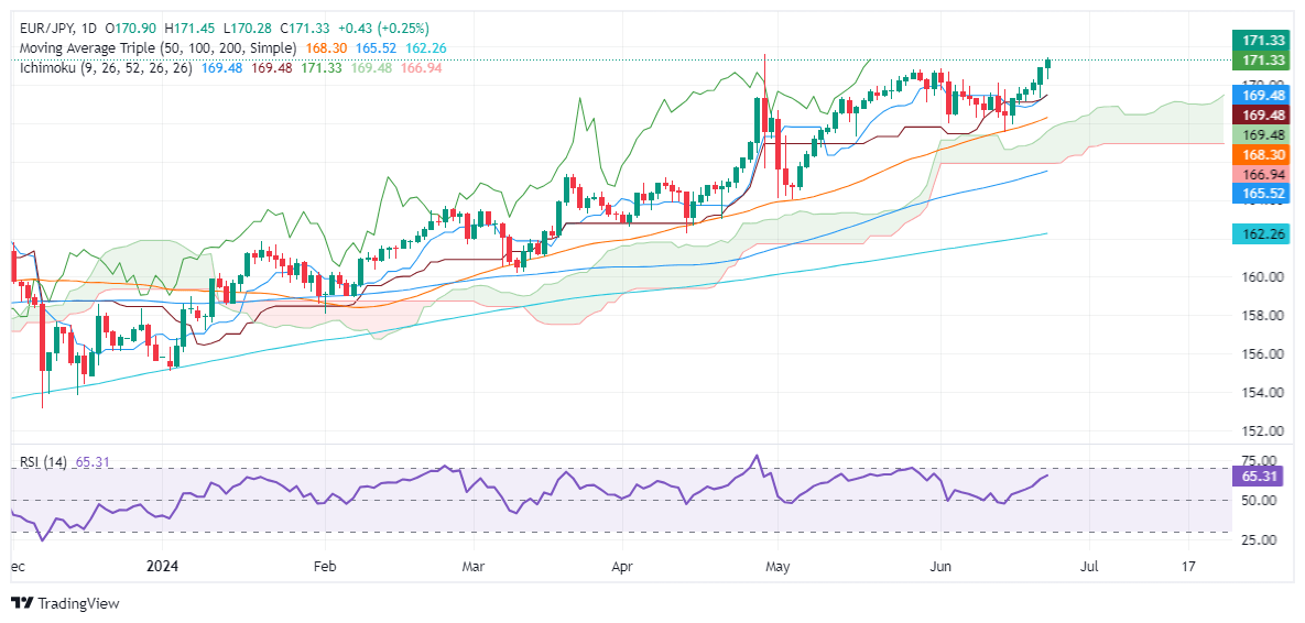The EUR/JPY extended its gains for the sixth straight day on Monday and is up 0.24%. Yet it remains shy of testing the year-to-date (YTD) high reached on April 29 at 171.58. At the time of writing, the cross is trading at 171.29, above the 171.00 key technical level.