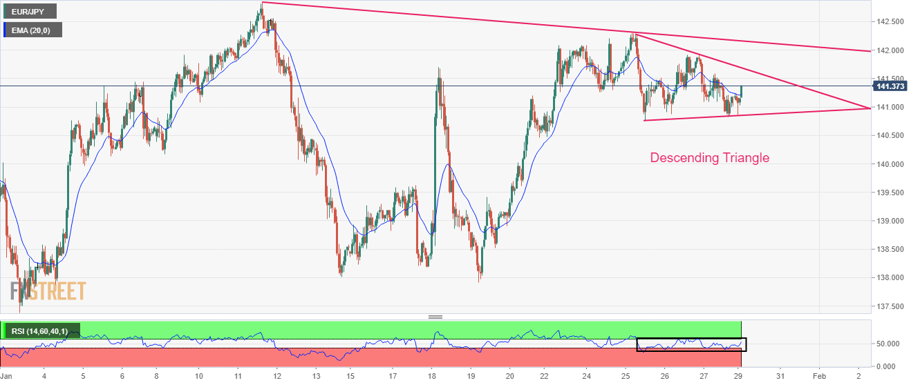 EUR/JPY is displaying rangebound action broadly in a Descending Triangle chart pattern on an hourly scale. The downward-sloping trendline of the above-mentioned chart pattern is plotted from January 25 high at 142.29 while the horizontal support is placed from January 25 low around 140.76. On a broader basis, the south side trendline from January 11 high at 142.61 will act as a major barricade for the Euro bulls.