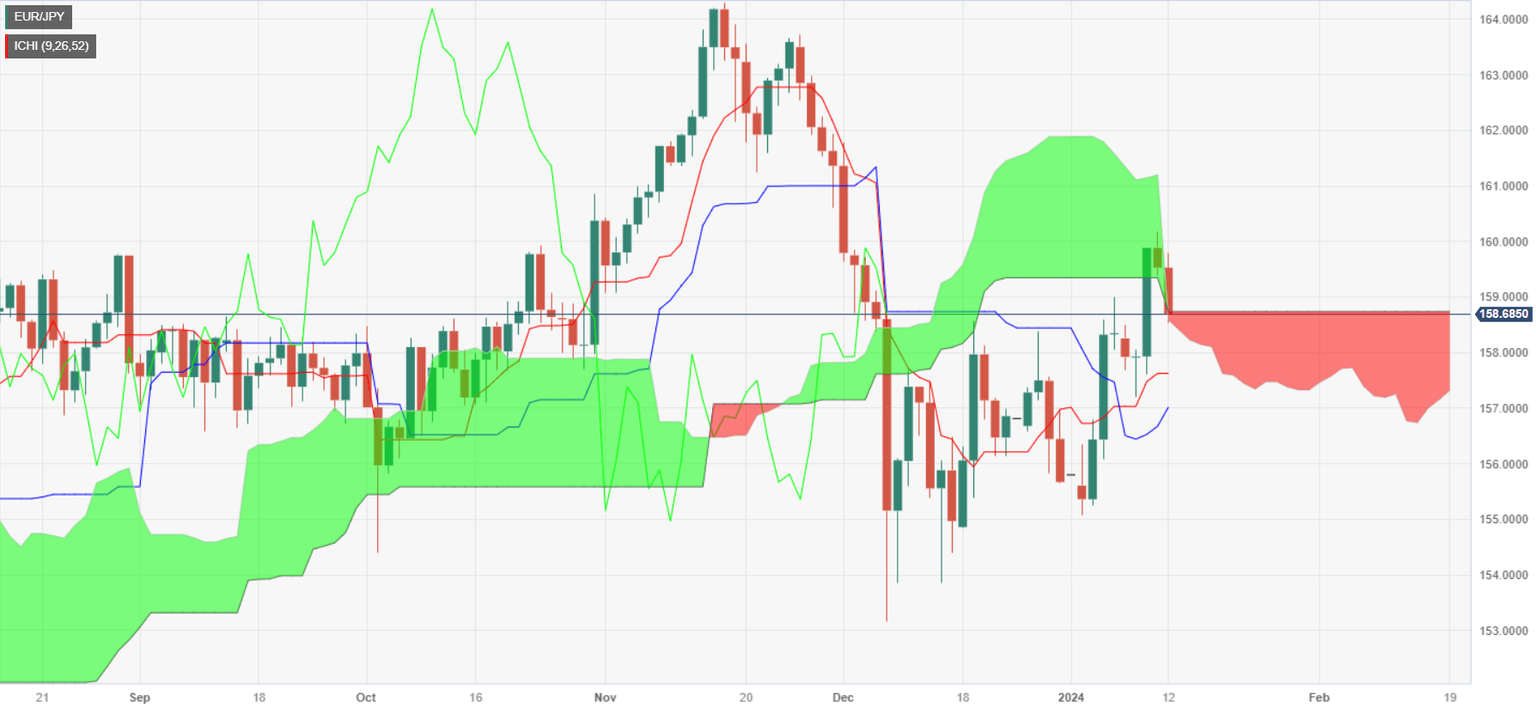 As mentioned above, EUR/JPY bears are gathering momentum, which could extend if they reclaim the December 19 swing high of 159.57, which could pave the way for breaking the next support seen at the 159.50 area, the bottom of the Kumo. In that outcome, the cross-pair could plunge sharply and challenge the Tenkan-Sen at 157.62, followed by the Senkou Span A at 157.14. Further downside is seen at the Kijun Sen at 156.64.