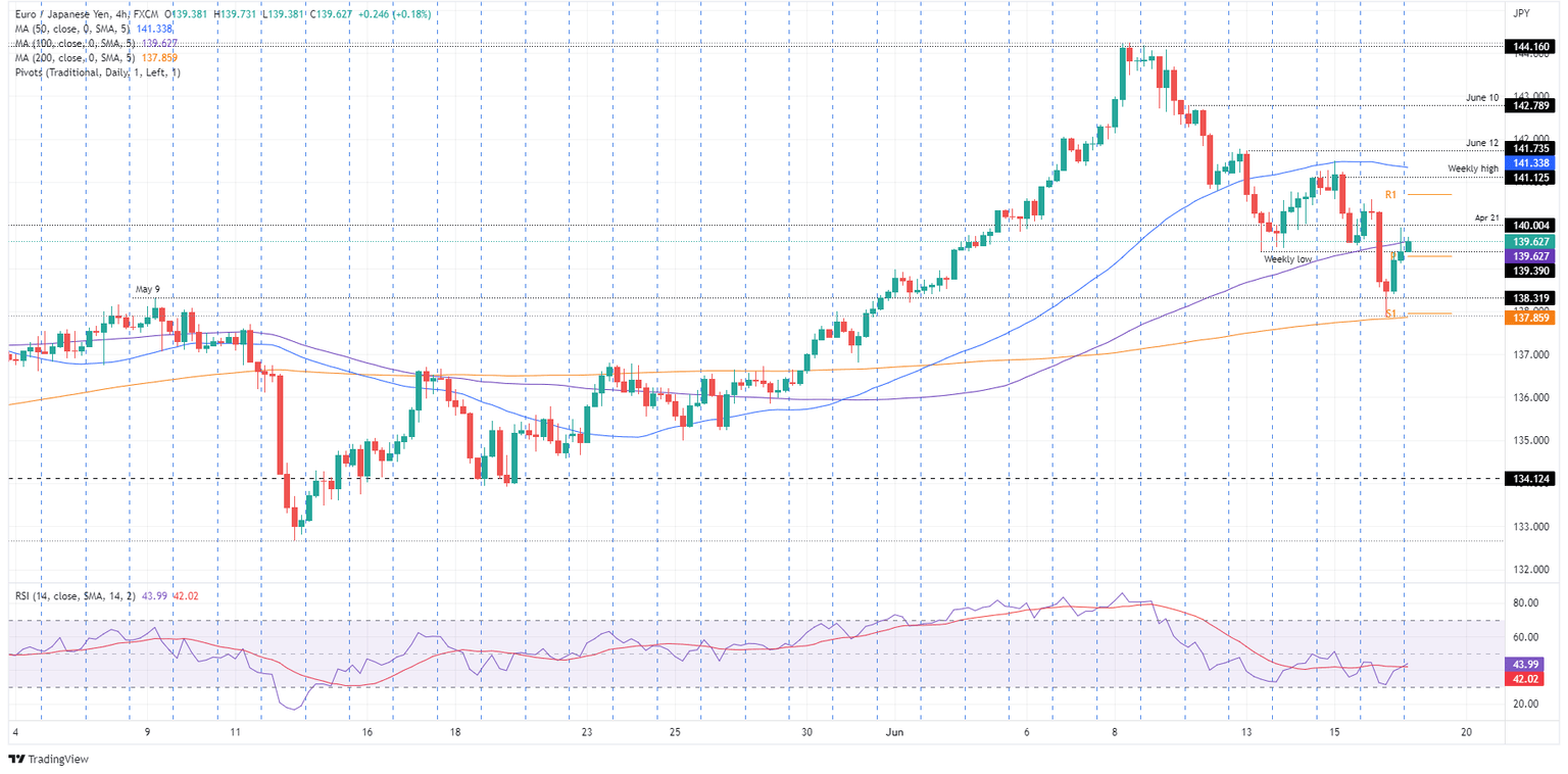 Hence, the EUR/JPY is upward biased. That said, the EUR/JPY’s first resistance would be June 16 high at 139.95. Break above would expose the R1 daily pivot at 140.74. Once cleared, the EUR/JPY’s next resistance would be 50-4H SMA at 141.33, followed by the aforementioned June 12 high.