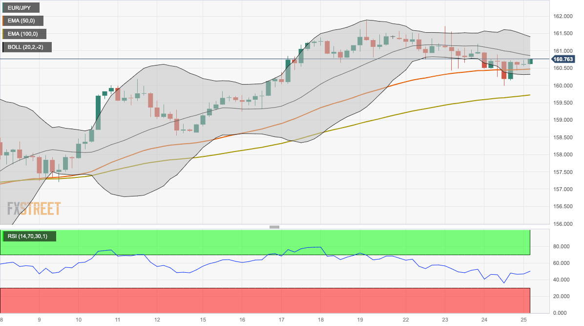 The EUR/JPY cross recovers some lost ground near 160.75 during the early European session on Thursday. The weaker-than-expected German and Eurozone PMI data for January weigh on the Euro (EUR) and act as a headwind for EUR/JPY. Investors await the European Central Bank (ECB) monetary policy meeting on Thursday, with no change in rate expected.