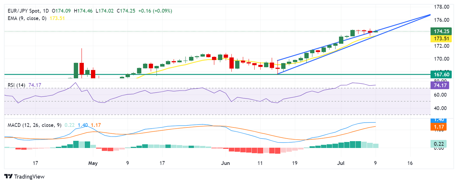 EUR/JPY halts its three-day losing streak, trading around 174.30 during the European hours on Tuesday. The analysis of the daily chart shows a rising wedge pattern, indicating a potential bearish reversal. Furthermore, the 14-day Relative Strength Index (RSI) is above the 70 level, suggesting the currency asset is overbought and may face a correction.
