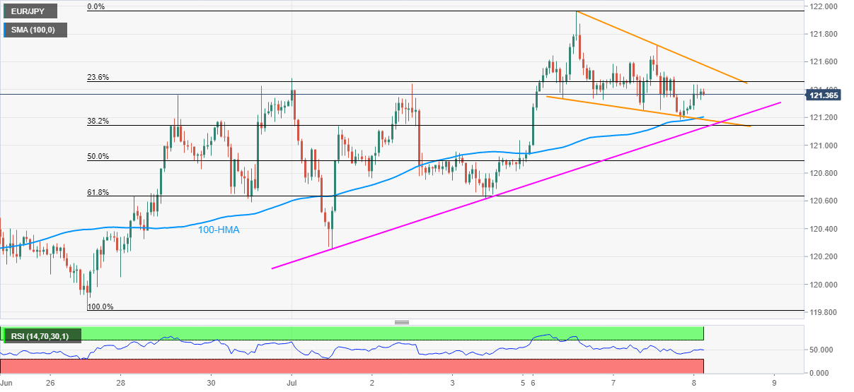 EUR/JPY gains 0.15% while rising to 121.40 during the early Wednesday. The pair recently bounces off 100-HMA and aims to confirm a short-term bullish chart formation on the hourly chart. Other than the 100-HMA an upward sloping trend line from July 01 also favors the buyers.