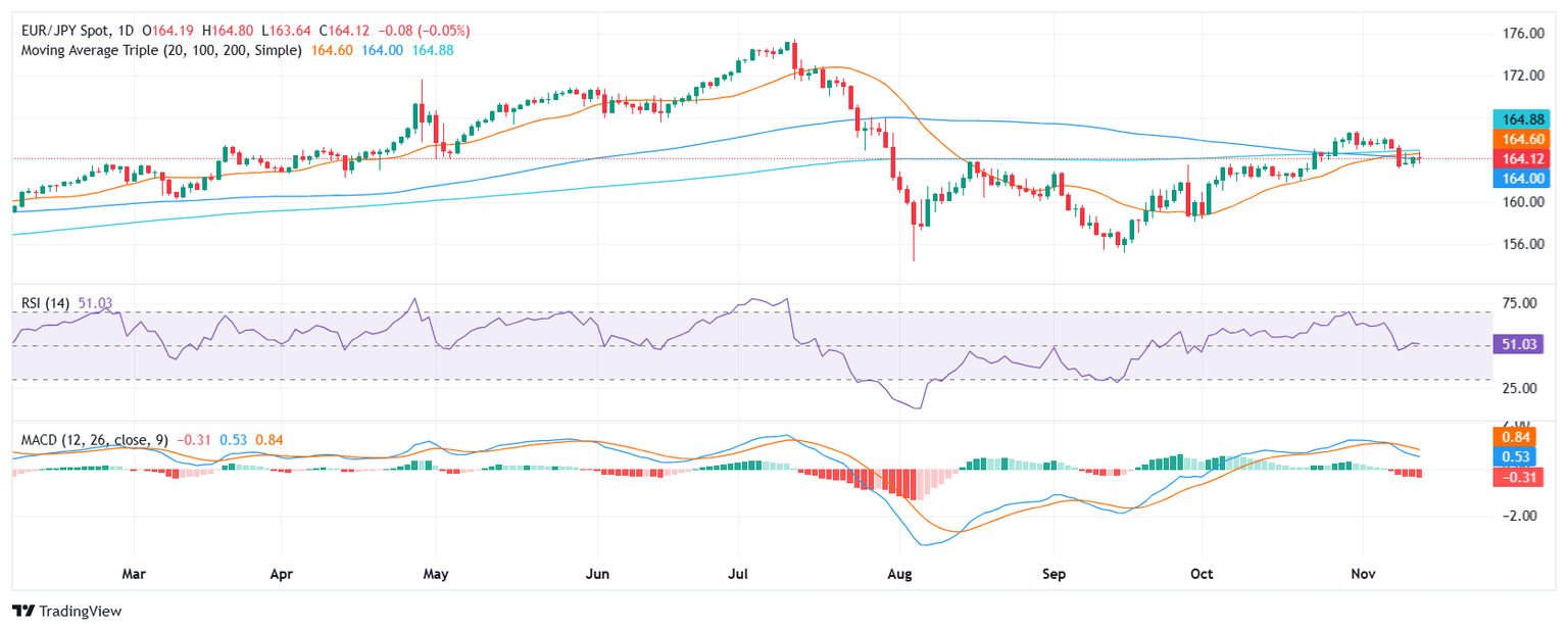 The 164.00-165.00 range serves as a crucial resistance zone, while the RSI's flat buying pressure and the MACD's growing selling pressure create an uncertain momentum. Traders should closely monitor whether bulls can break through this resistance area to confirm a bullish trend, or if bears push the pair lower towards key support levels at 163.00 and 162.00.