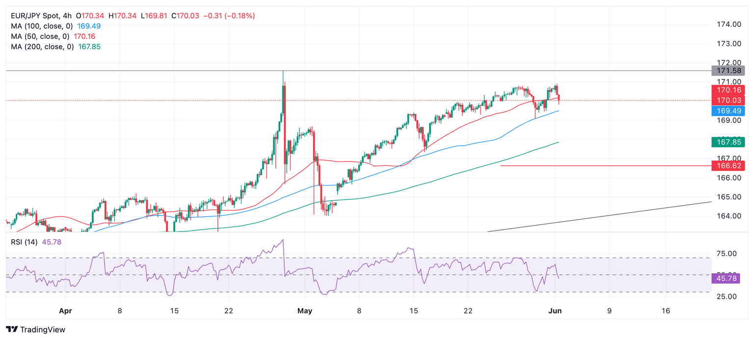 A break above 170.89 (June 3 high) would establish a higher high and probably indicate a continuation of the uptrend. The next target to the upside is 171.60, the high of April 29.