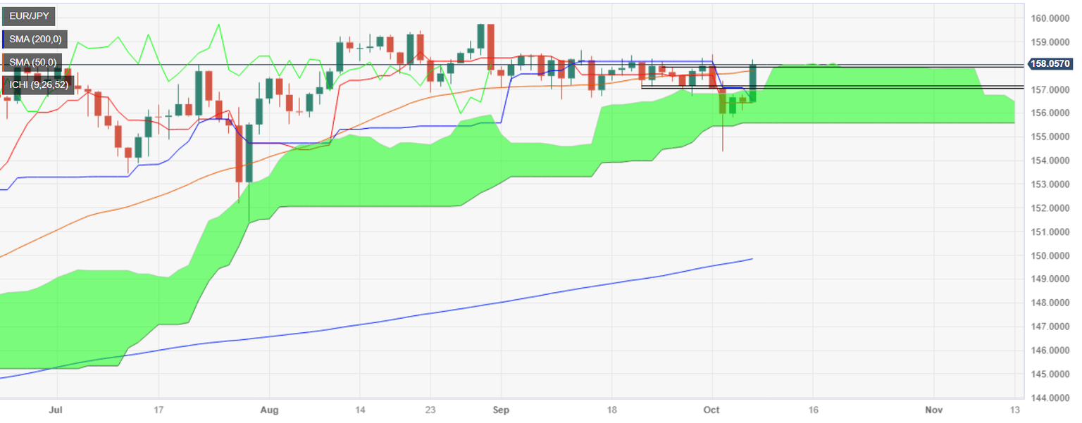 From a technical perspective, the EUR/JPY remains consolidated in the daily chart despite breaking above the Ichimoku Cloud (Kumo), which is usually seen as a bullish signal, but immediate resistance would cap the Euro’s intentions of higher prices. If the pair aims higher, the first resistance is seen at the October 2 high of 158.47, followed by the September 13 daily high of 158.65, before challenging 159.00