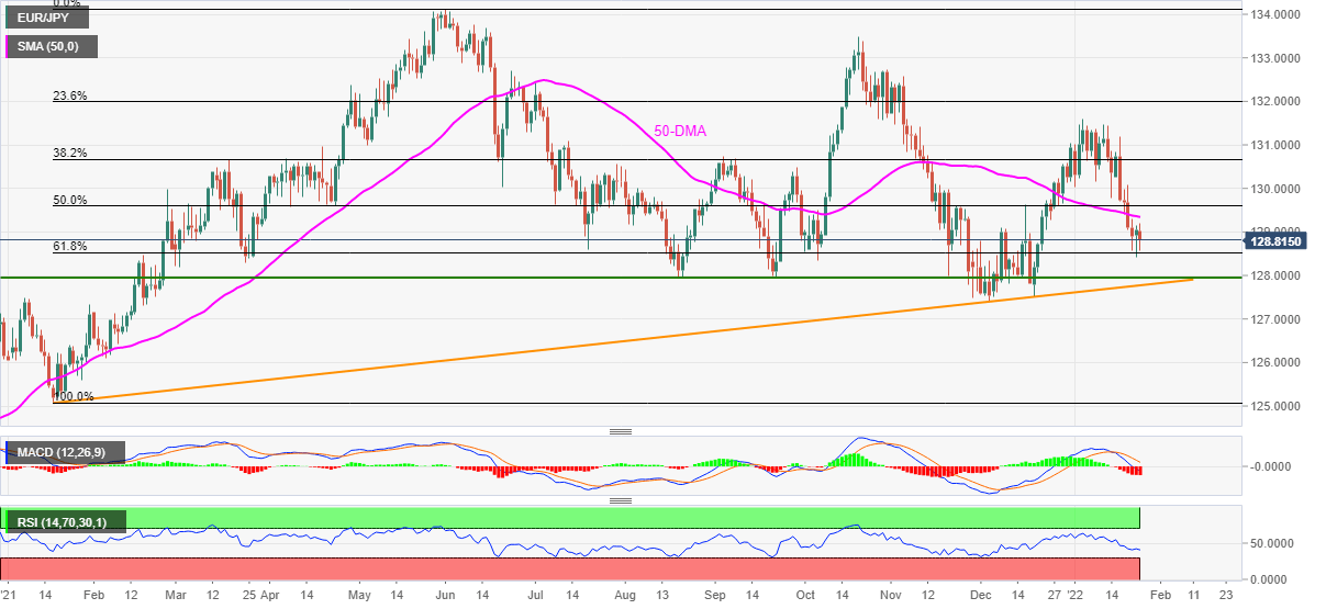 Even so, the cross-currency pair remains on the bear’s radar as it fails to extend the previous day’s corrective pullback from monthly low, also comprising the 61.8% Fibonacci retracement (Fibo.)level of January-May 2021 upside, near 128.50.