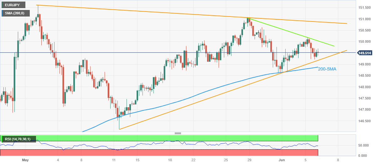 With this, the EUR/JPY bears approach the aforementioned triangle’s bottom line, close to 149.15 by the press time, ahead of poking the 200-SMA support level surrounding 148.85.