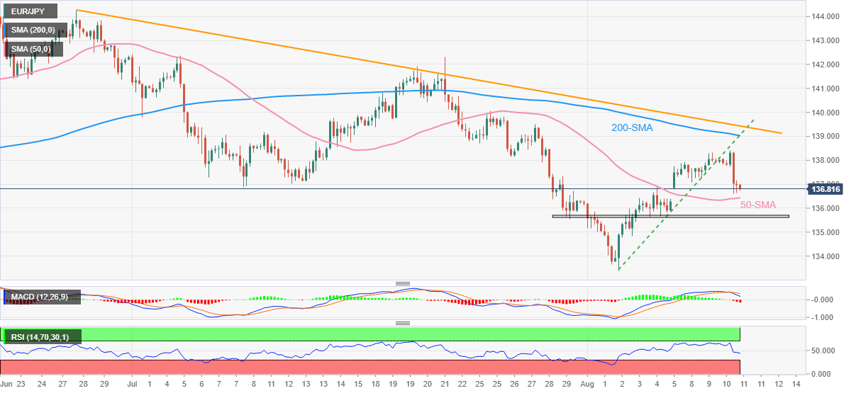 EUR/JPY holds lower ground near 136.80, after renewing the multi-day low on the break of the weekly support line. However, the 50-SMA challenges the pair sellers during Thursday’s initial Asian session.