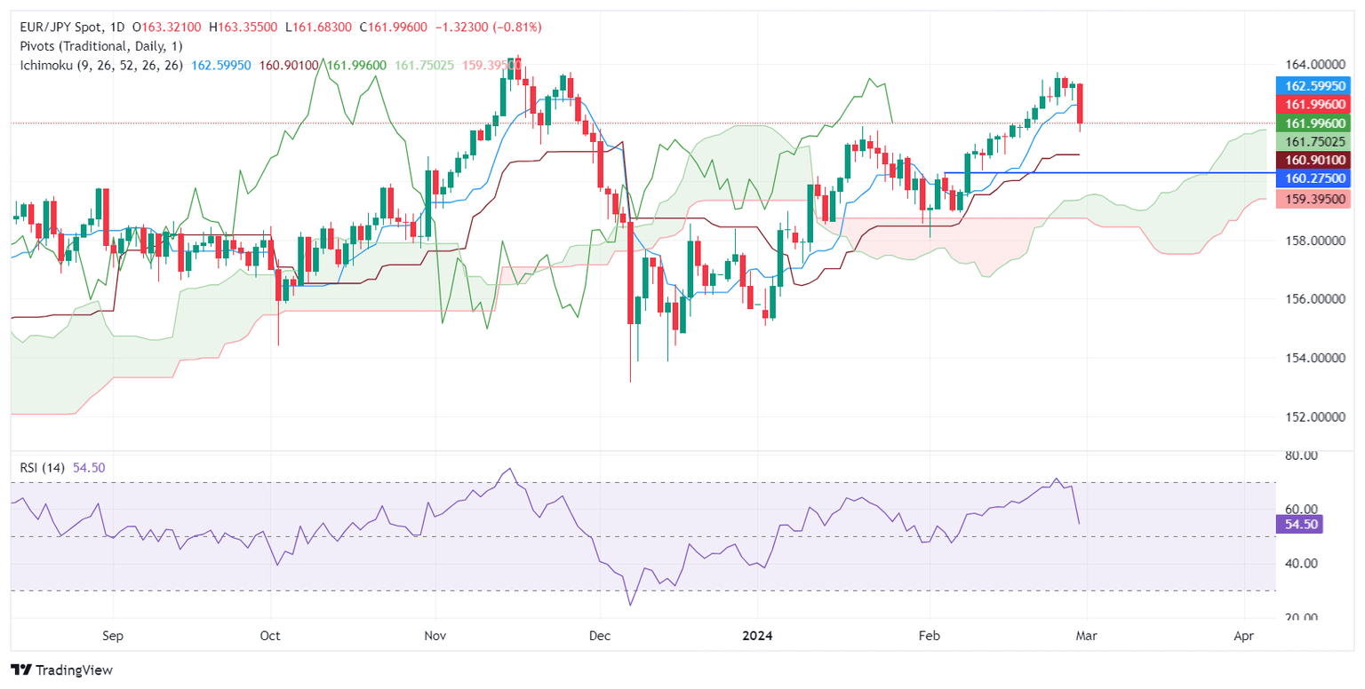 The pair fell below 162.59, the Tenkan-Sen level, and slumped below the 162.00 figure, hitting a daily low of 161.68. However, the EUR/JPY recovered and reclaimed 162.00, though downside risks remain. If sellers achieve a daily close below 162.00, further weakness lies ahead. The next support would be the Senkou Span A at 161.75, followed by the 161.00 mark, and the Kijun Sen at 160.90.