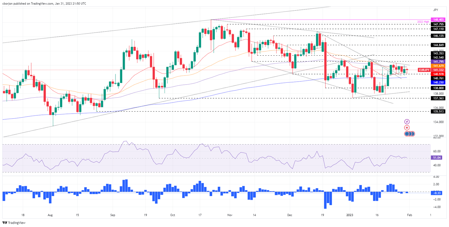 During the last seven days, the EUR/JPY pair has been unable to reach new highs, above the January 25 daily high at 142.29, exacerbating a consolidation within the 20 and 50-day EMA. Backed by the Relative Strength Index (RSI) and the Rate of Change (RoC) almost flat at neutral levels, the EUR/JPY pair would remain trendless, awaiting the Europen Central Bank (ECB) monetary policy on Thursday.