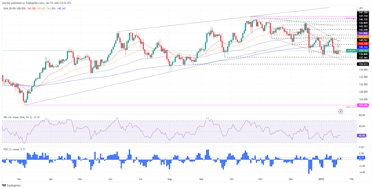 The EUR/JPY daily chart portrays the pair as neutral-downward biased, as it remains below the daily Exponential Moving Averages (EMAs). Also, the 20-day EMA at 140.29 is about to cross below the 200-day EMA at 140.14, which would resume the downtrend in the near term. Solid support is found around the last week’s low of 138.01, tested on Thursday, though the EUR/JPY quickly rebounded towards the 139.00 figure.