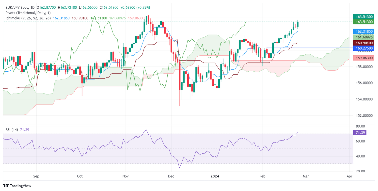 The EUR/JPY advances sharply and regains the 163.00 figure as traders capitalize on the broad Japanese Yen (JPY) weakness. The latest fundamental news from Japan is that its economy is cooling, while inflation is expected to get below the Bank of Japan's (BoJ) 2% goal on its core figures. At the time of writing, the pair exchanged hands at 163.55, up 0.42%.