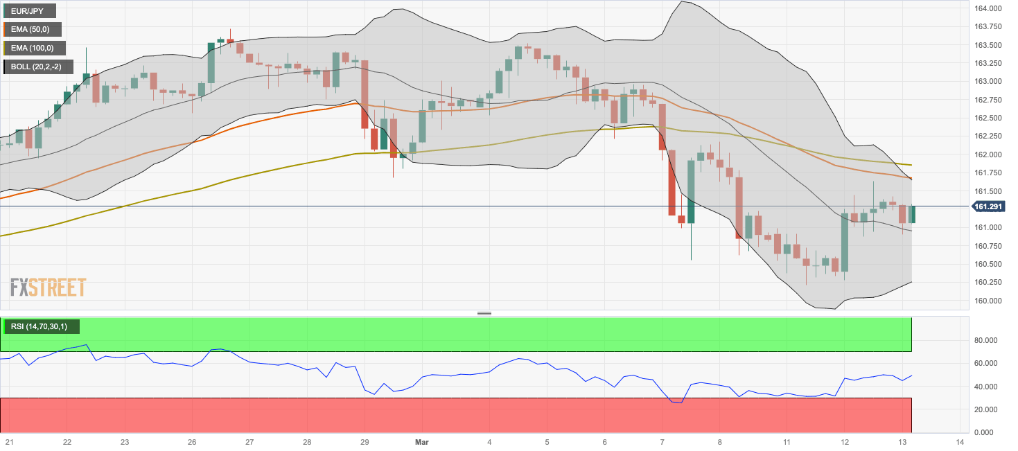 The key upside barrier for EUR/JPY will emerge at the confluence of the upper boundary of the Bollinger Band and the 50-period EMA at 161.65. Further north, the next hurdle is seen at the 100-period EMA at 161.85. Any follow-through buying above this level will see a rally to a high of March 8 at 162.17, followed by a high of March 6 at 162.95.