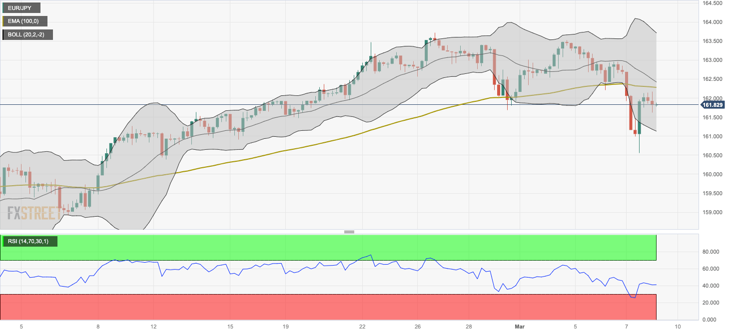 The EUR/JPY cross remains under some selling pressure below the 162.00 psychological barrier during the early European session on Friday. The growing speculation that the Bank of Japan (BoJ) could remove negative interest rates this month lifts the Japanese Yen (JPY) against the Euro (EUR). At press time, EUR/JPY is trading at 161.85, down 0.16% on the day.