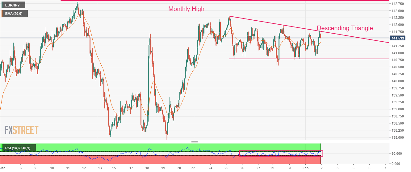 EUR/JPY is auctioning near the downward-sloping trendline of the Descending Triangle chart pattern on an hourly scale, which indicates a contraction in volatility. The downward-sloping trendline of the chart pattern is plotted from January 25 high at 142.29 while the horizontal support is placed from January 25 low at 140.75.