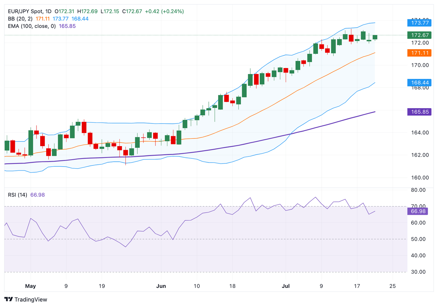 On the bright side, the first upside barrier for the cross emerges at 173.11, the high of July 18. A decisive break above this level could pick up more momentum and aim for the crucial resistance level at 173.75, the upper boundary of the Bollinger Band and psychological level. Further north, the additional upside filter to watch is 174.52, the high of July 3, 2024.