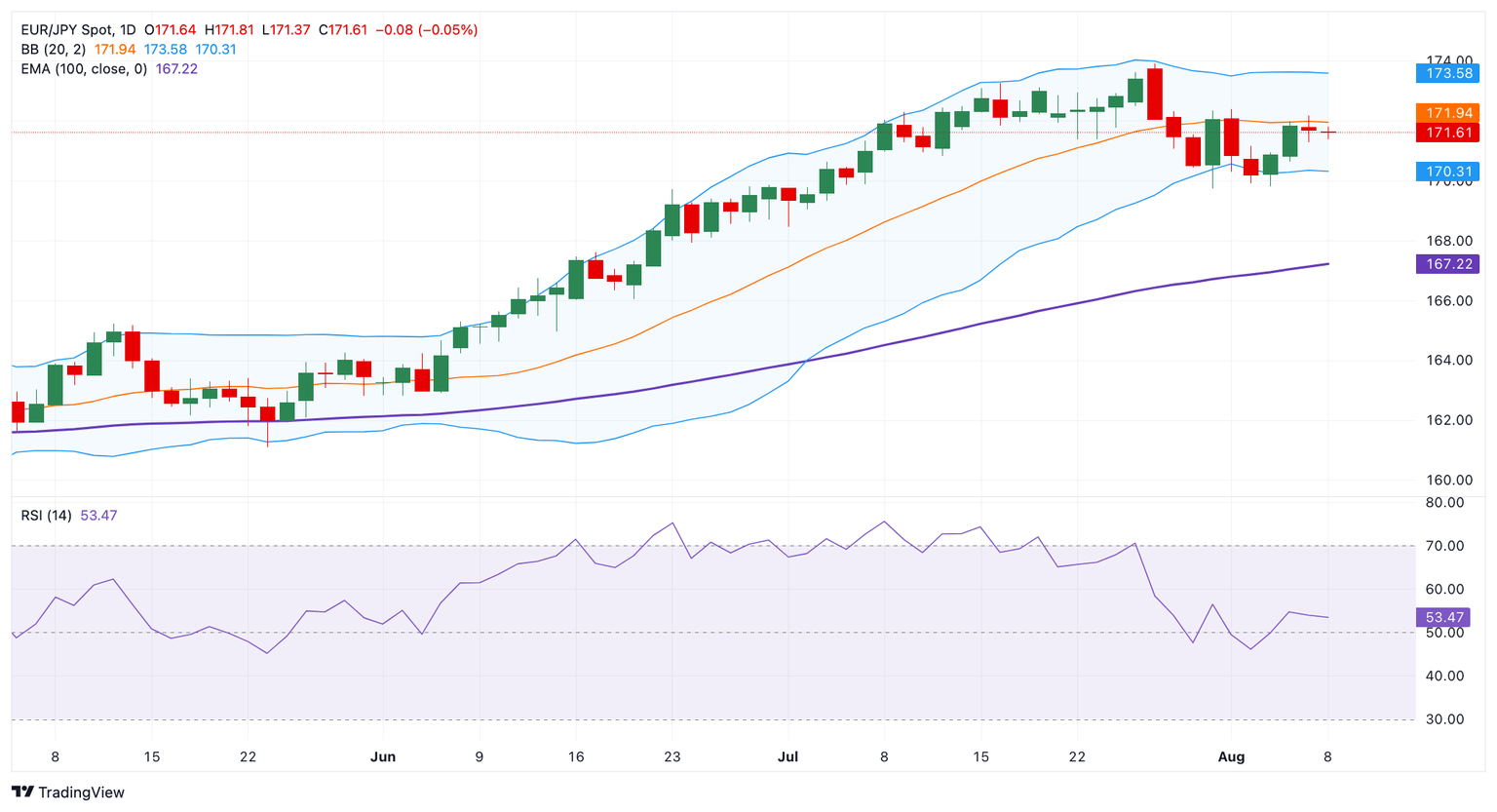 The EUR/JPY cross loses traction to around 171.60 during the early European session on Friday. The Japanese Yen (JPY) edges higher against the Euro (EUR) after the Japanese trade envoy’s comments. Early Friday, Ryosei Akazawa said that the United States (US) has agreed to correct a presidential order on tariffs and refund any excess duties collected in error. Akazawa further stated that there was no disagreement between the US and Japan over reciprocal tariffs.