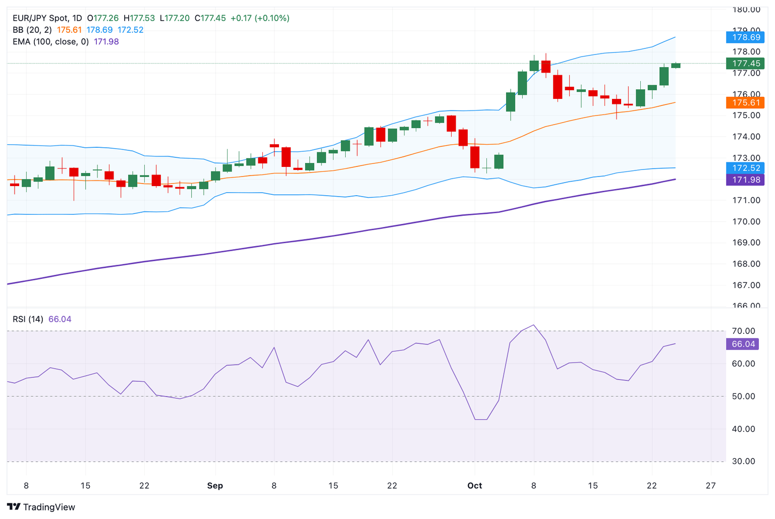 The EUR/JPY cross trades in positive territory for the fourth consecutive day around 177.45 during the early European session on Friday. The Japanese Yen (JPY) softens against the Euro (EUR), even as core inflation in Japan accelerated in September for the first time since May.