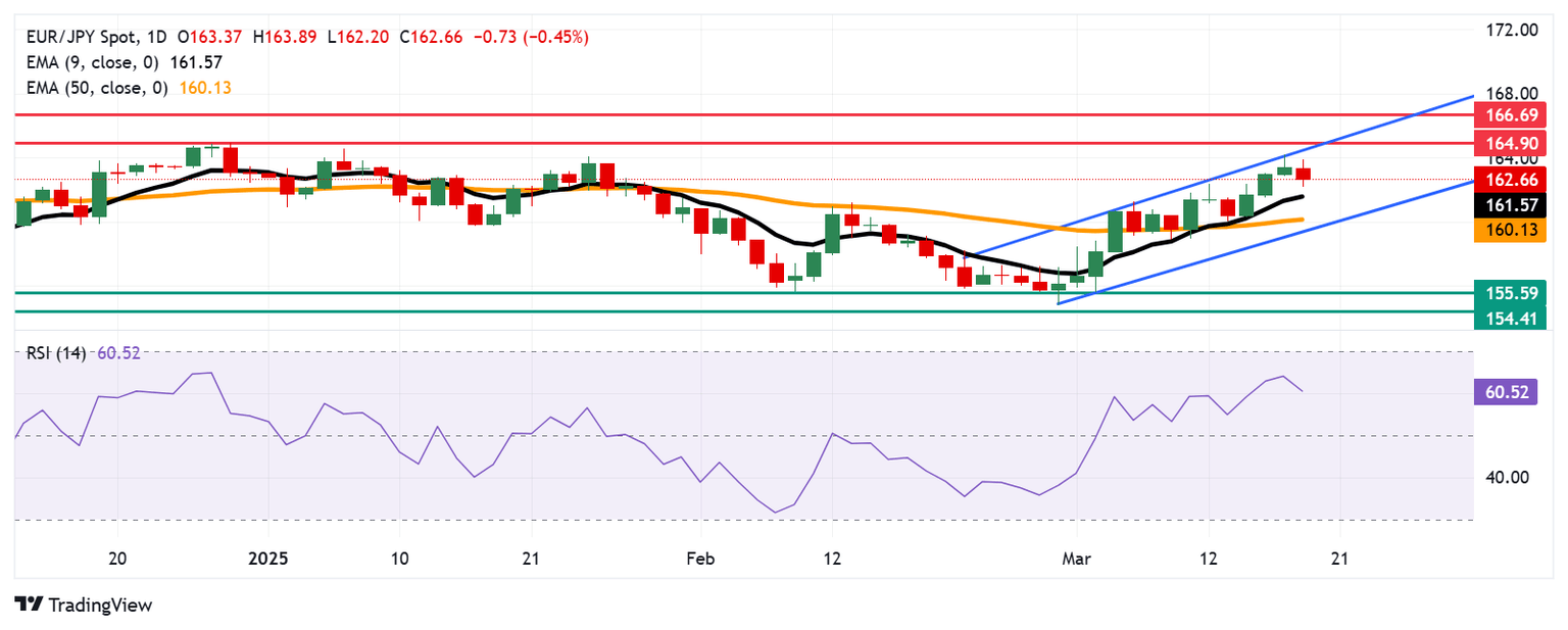 - EUR/JPY may face key resistance at the upper boundary of the ascending channel near 164.50.