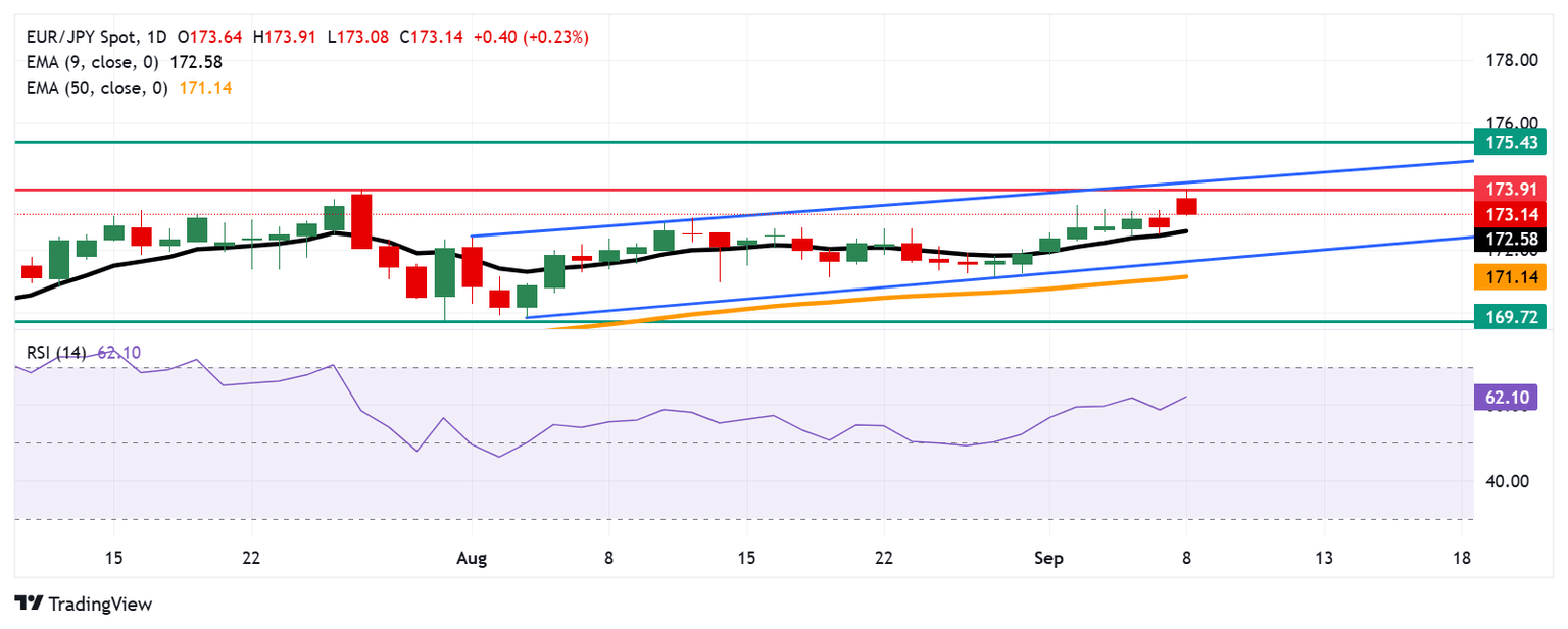 On the upside, the EUR/JPY cross may approach the 173.91, the highest since July 2024, recorded on September 8, followed by the upper boundary of the ascending channel around the 174.10. A break above this crucial resistance zone would strengthen the bullish bias and support the currency cross to approach the all-time high of 175.43, reached in July 2024.
