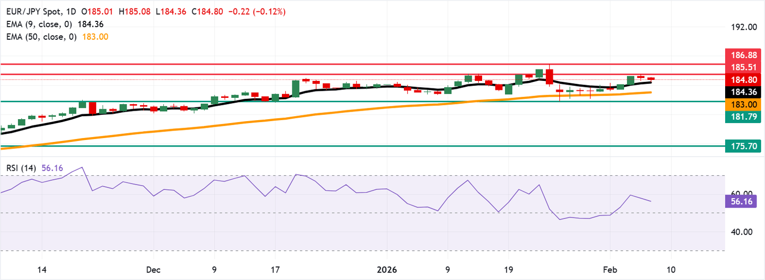 EUR/JPY extends its losses for the second successive session, trading around 184.70 during the Asian hours on Friday. The technical analysis of the daily chart suggests that the 14-day Relative Strength Index (RSI) at 55.67 (neutral) stays north of 50, confirming a mild upside skew. RSI leans upward, keeping momentum on the buy side.