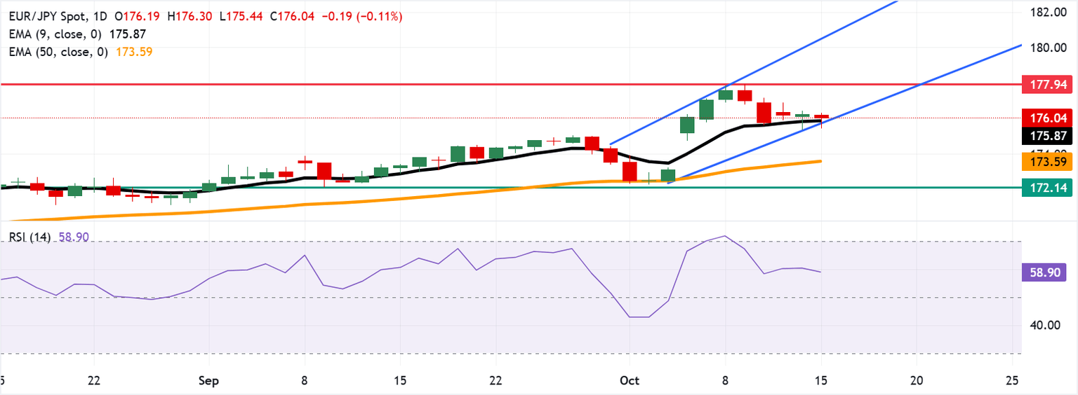 The EUR/JPY cross is testing its immediate support at the nine-day EMA of 175.87, aligned with the ascending channel’s lower boundary around 175.80. A break below this confluence support zone would weaken the bullish bias and put downward pressure on the currency cross to navigate the area around the 50-day EMA at 173.59, followed by the six-week low of 172.14, which was recorded on September 9.
