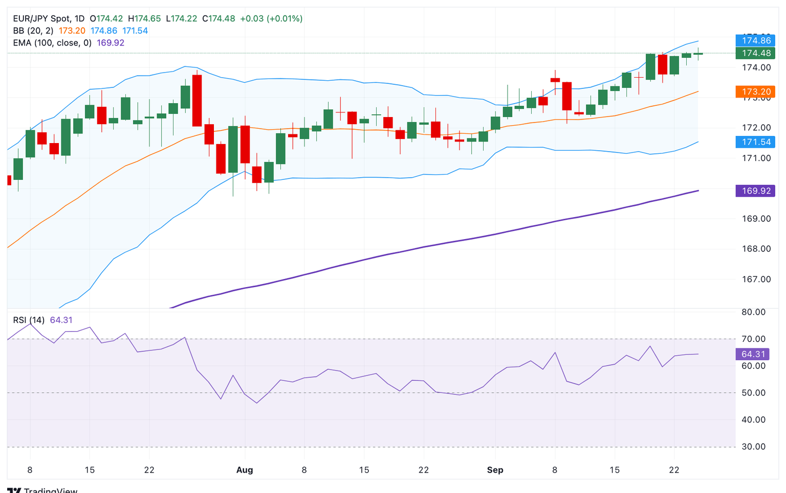The EUR/JPY cross posts modest gains near 174.50 during the early European trading hours on Wednesday. The Japanese Yen (JPY) softens against the Euro (EUR) after the latest S&P Global flash Japan Manufacturing Purchasing Managers' Index (PMI) fell at the fastest pace in six months in September.
