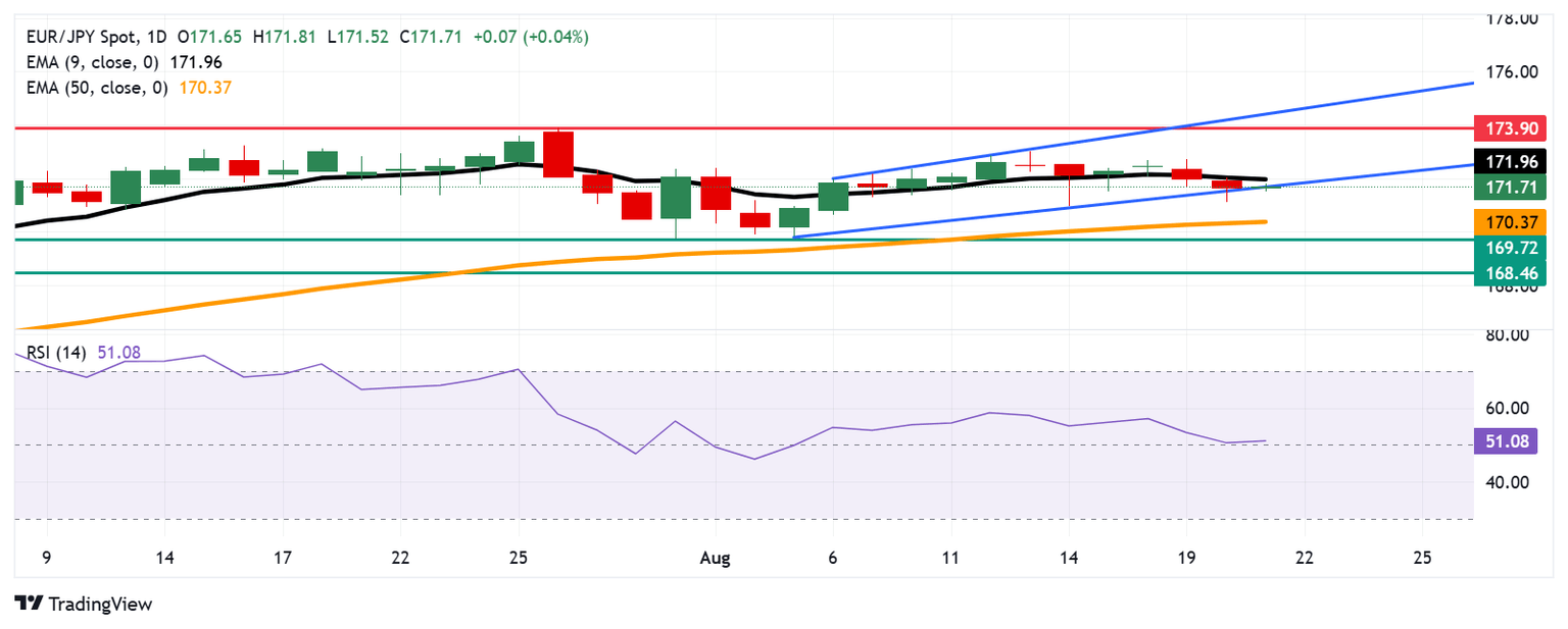 On the upside, the immediate barrier appears at the nine-day EMA of 171.96, aligned with the psychological level of 172.00. A break above this crucial resistance zone would reinforce the bullish bias and support the currency cross to explore the region around 173.90, the highest since July 2024, recorded on July 28, 2025, followed by the upper boundary of the ascending channel around 174.50.