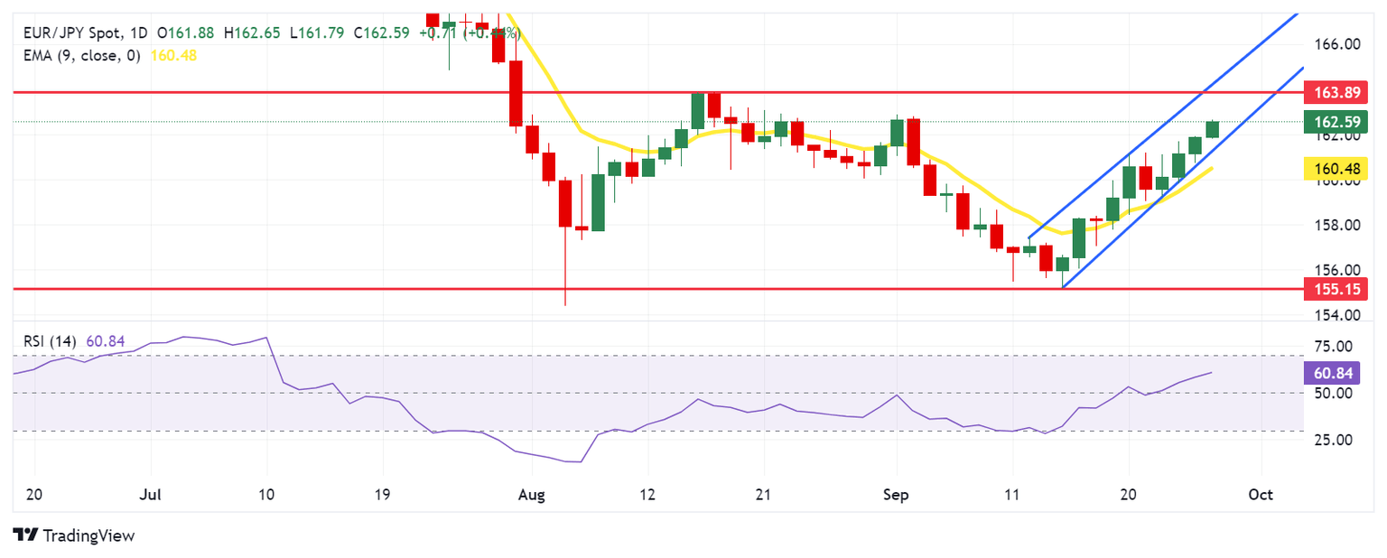 EUR/JPY extends its upside for the fourth consecutive day, trading around 162.50 during the Asian session on Friday. Technical analysis of the daily chart shows the pair is moving upwards within the ascending channel, suggesting an ongoing bullish bias.