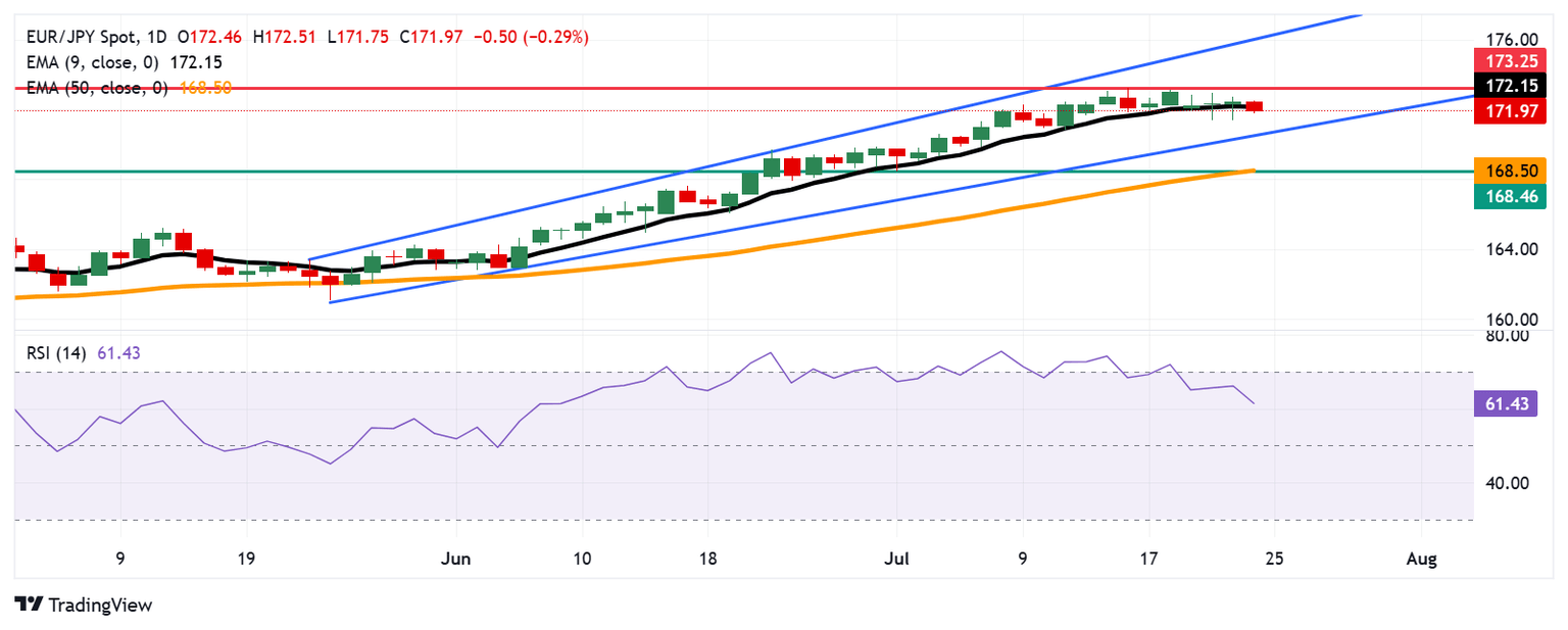On the upside, the immediate barrier appears at the nine-day EMA of 172.15, followed by the fresh yearly high of 173.25, reached on July 16. A break above this level could strengthen the bullish bias and support the EUR/JPY cross to navigate the region around the upper boundary of the ascending channel at 176.10.