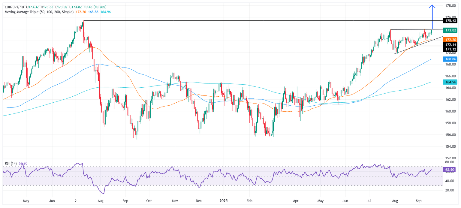 - EUR/JPY extends rally for second day, trading at 173.80 with bullish technical setup reinforcing upside potential.