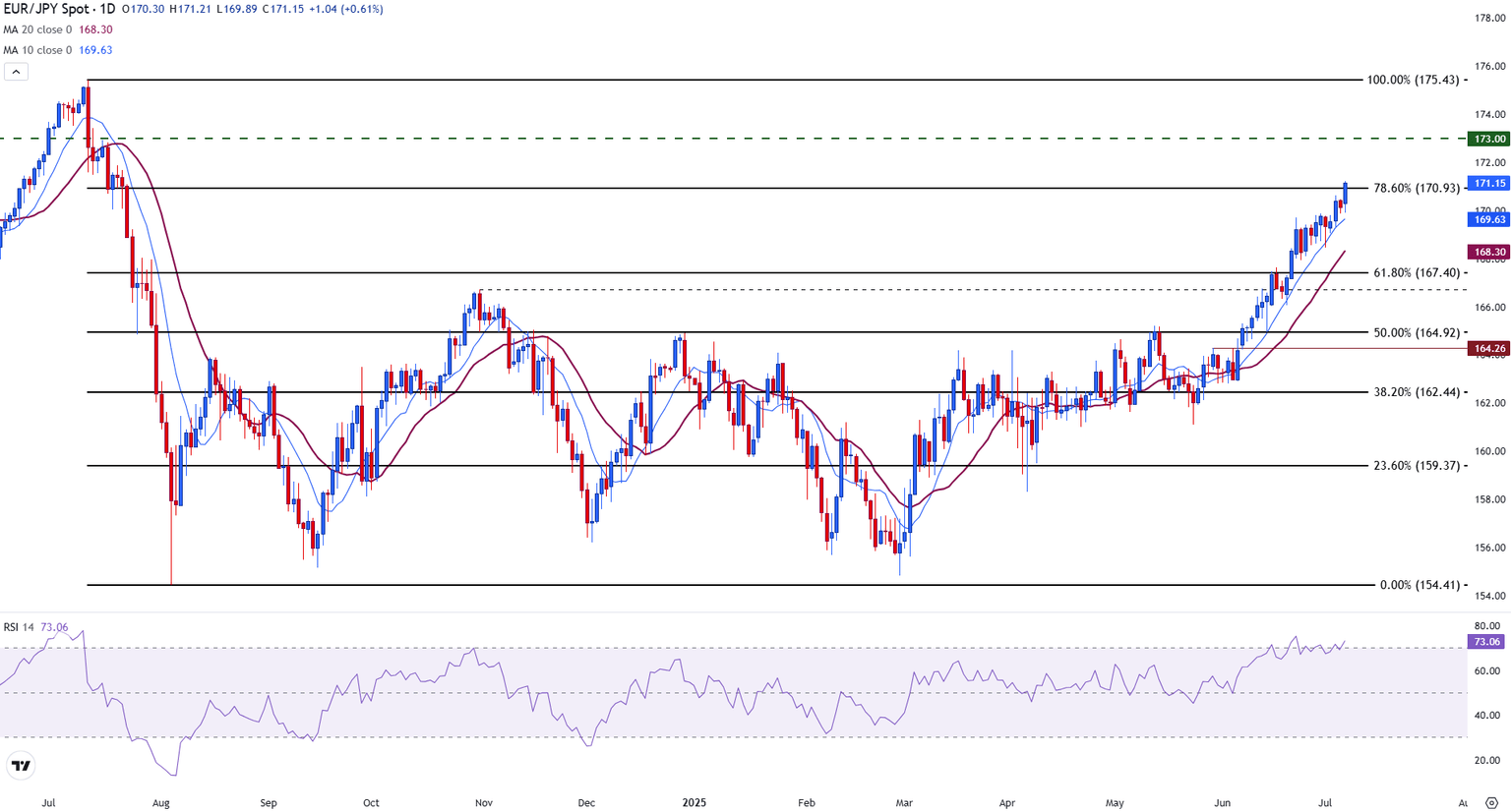 EUR/JPY continues to trend higher, extending its bullish breakout above the 78.6% Fibonacci retracement level of the July-August 2024 decline at 170.93.