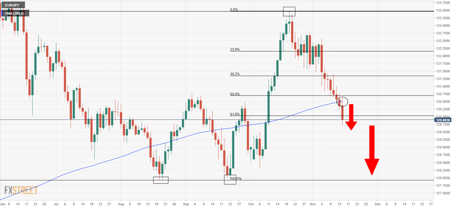 EUR/JPY slides below 130.00 amid broad euro underperformance, technicians eye push towards 128.00