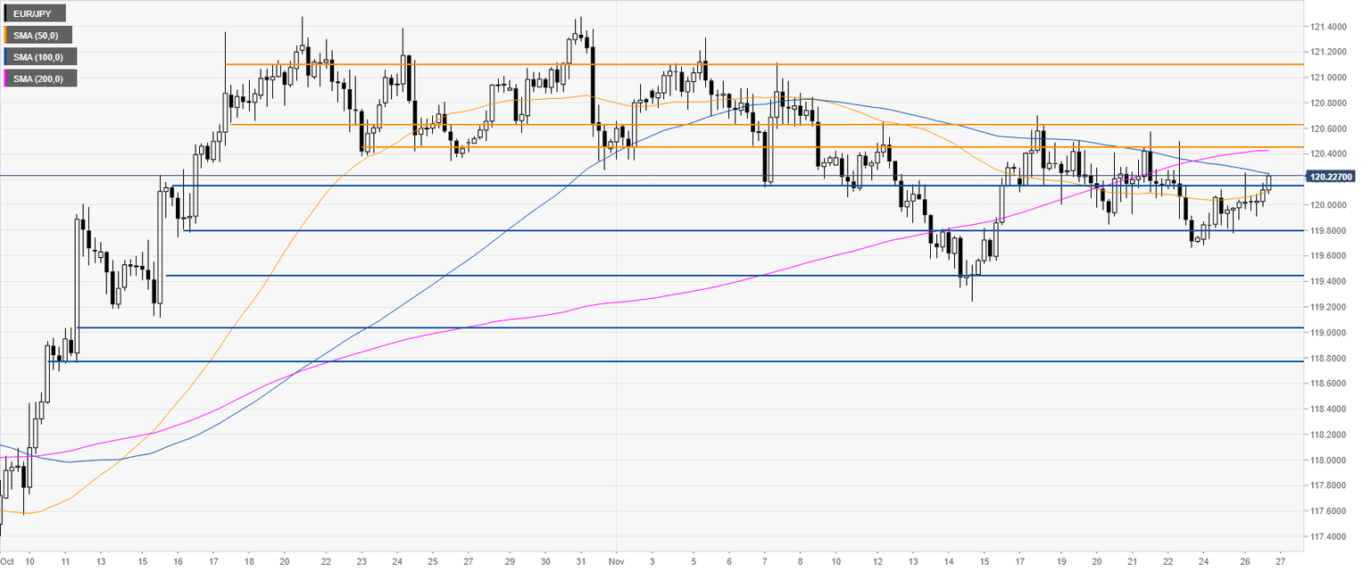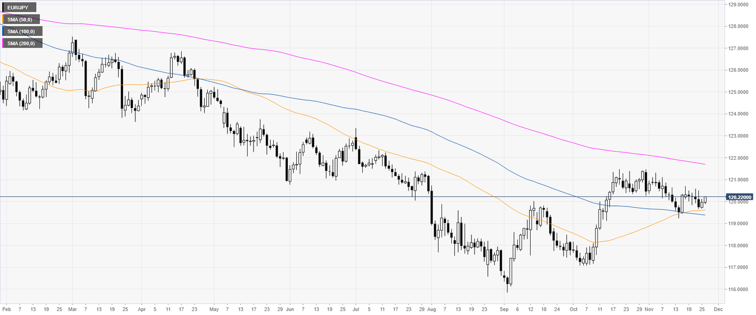 EUR/JPY is trading in a downtrend below the 200-day simple moving average (DMA). The market is currently consolidating the October bull run as the market stays capped by the 121.00 handle.