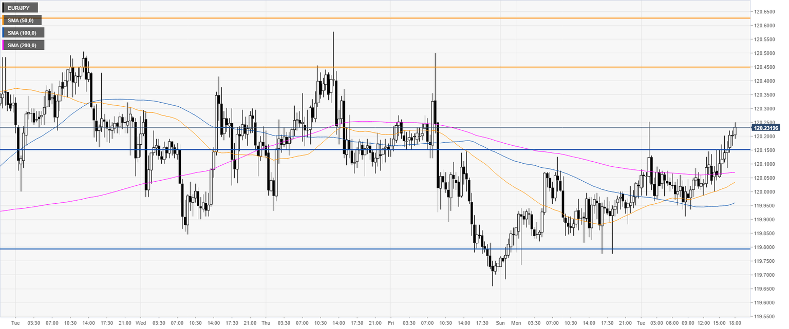 The market is grinding up above the 120.00 while challenging the 100 SMA. If the spot holds above 120.15, the current move can extend to the 120.45/63 resistance zone near the 200 SMA, according to