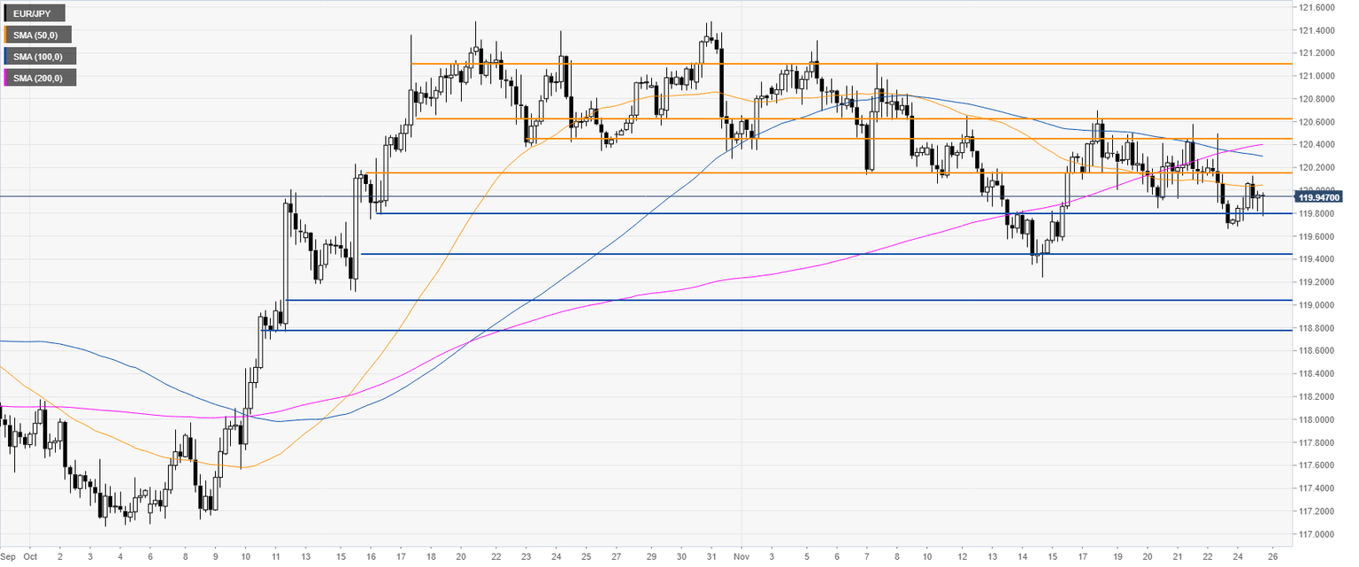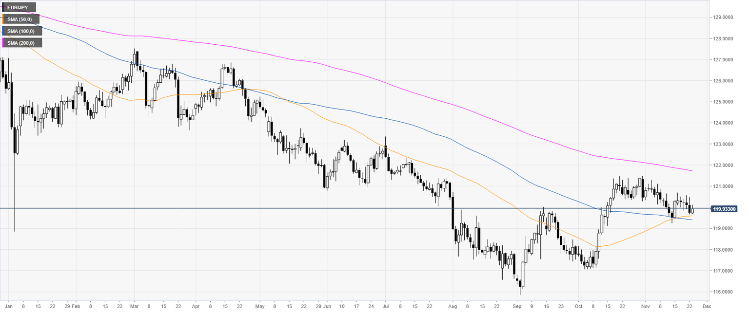 EUR/JPY is trading in a bear trend below its 200-day simple moving average (DMA). The market is presently correcting the October rally as the spot stays capped by the 121.00 handle.