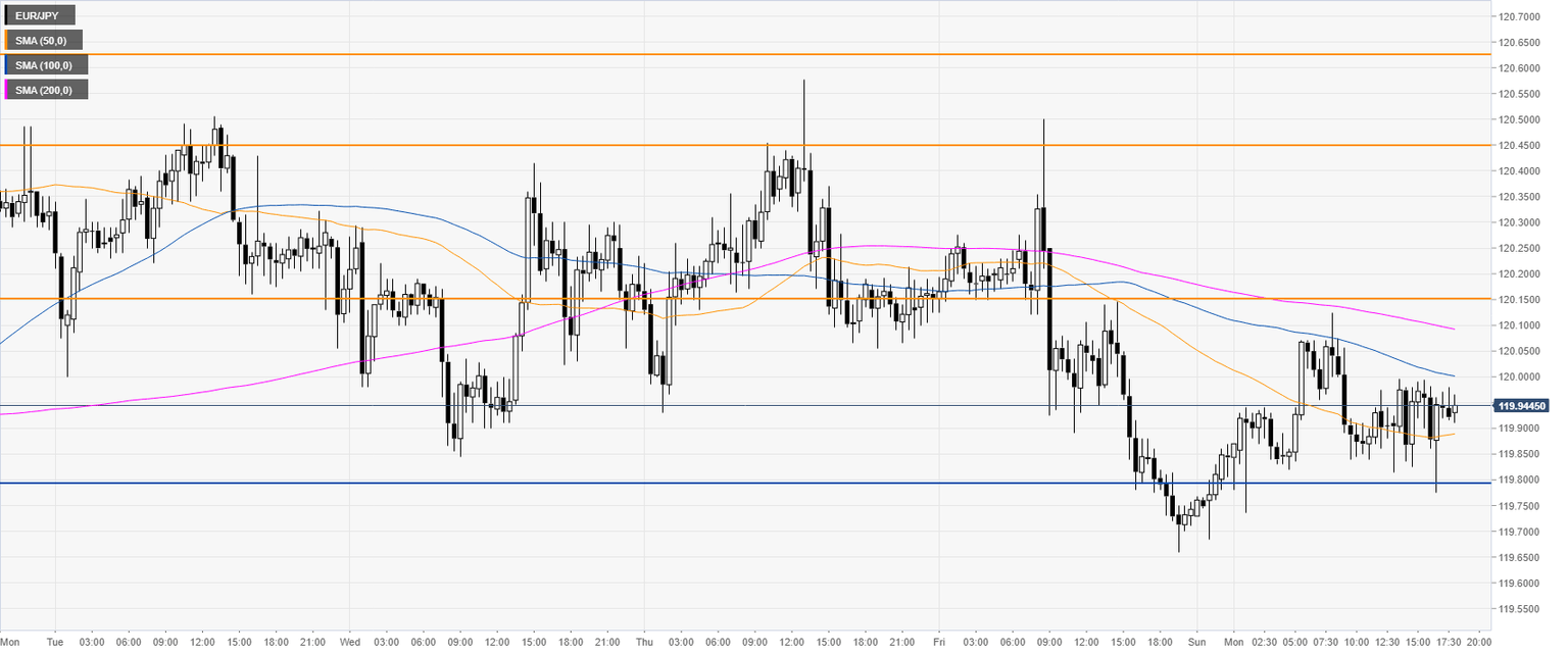 The cross is having a mixed session while trading below the 100/200 SMAs. As the outlook is bearish, resistance can be expected at the 120.15 and 120.45 levels.