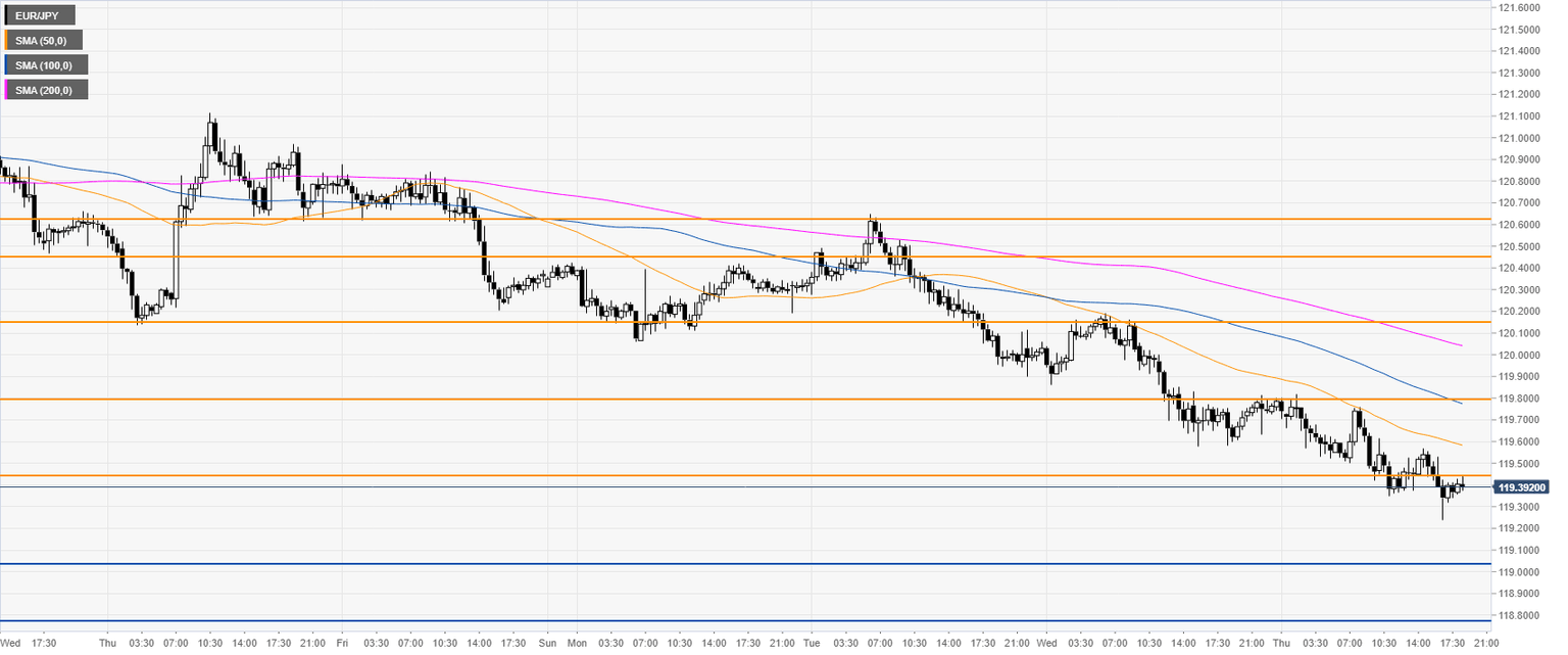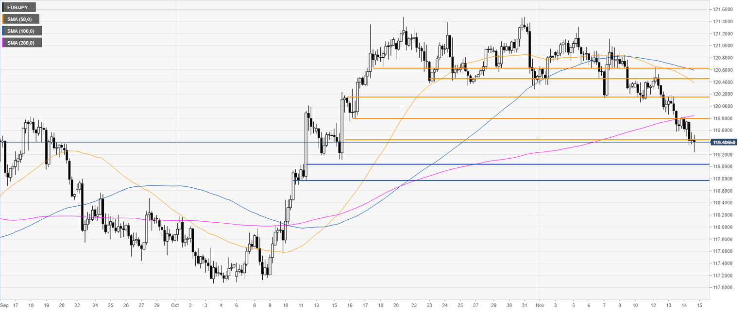 EUR/JPY is trading in a bear trend below its 200-day simple moving average (DMA). The market is correcting down after the October bull run as the price is challenging the 50 and 100 DMA near the 119.43 level.