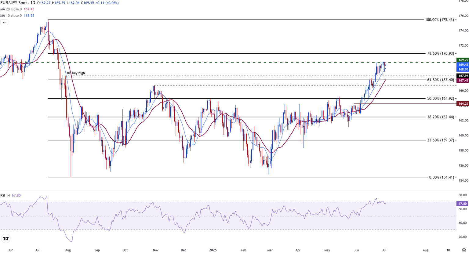 Both fundamental and technical factors influence the near-term trajectory of EUR/JPY. If bulls manage to break above 170, the 78.6% Fibonacci retracement level of the July-August 2024 decline may come into play as resistance at 170.93, just below the round number of 171.00.