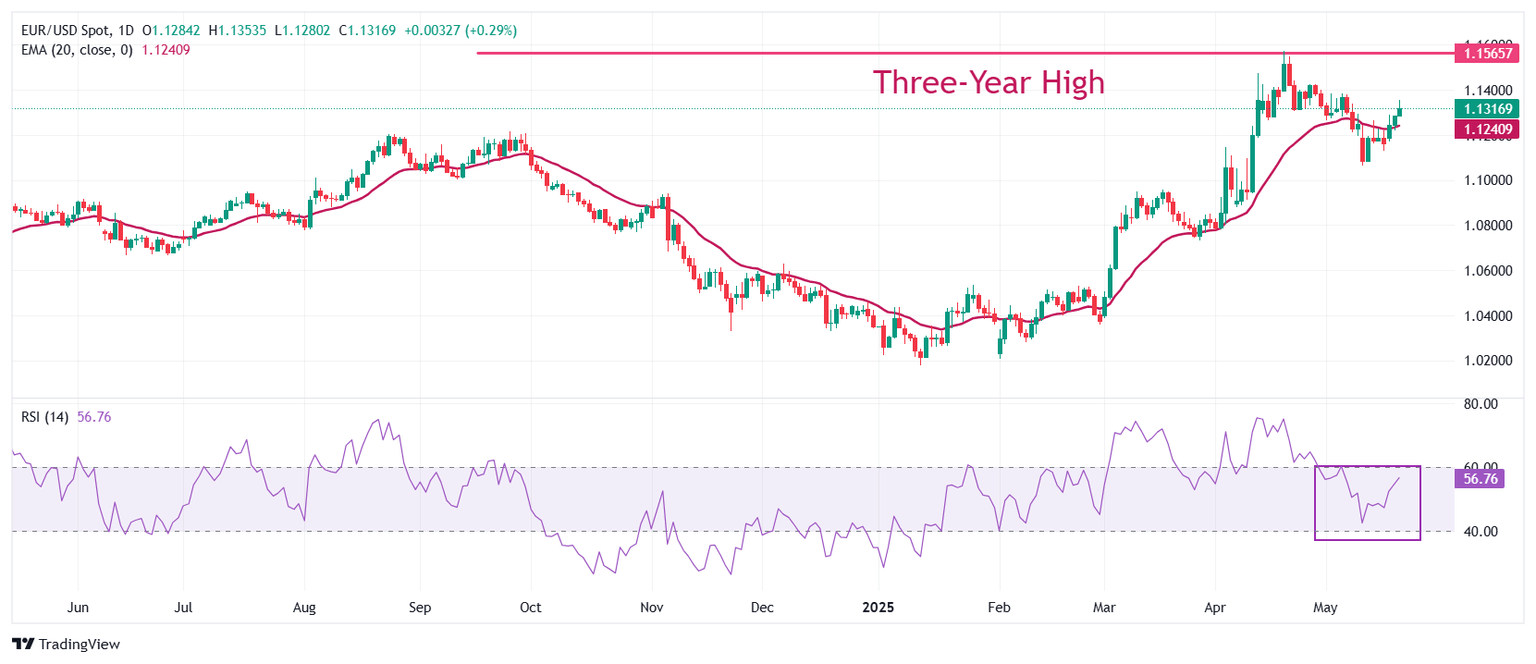 - EUR/USD rises further to near 1.1350 as the US Dollar remains under pressure due to Moody’s downgrade to the US credit rating.