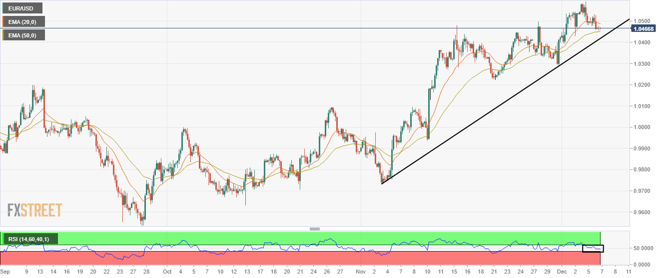 EUR/USD is declining towards the upward-sloping trendline placed from November 3 low at 0.9730. The major currency pair has dropped below the 20-period Exponential Moving Average (EMA) at 1.0487 while the 50-EMA at 1.0451 is still untouched.
