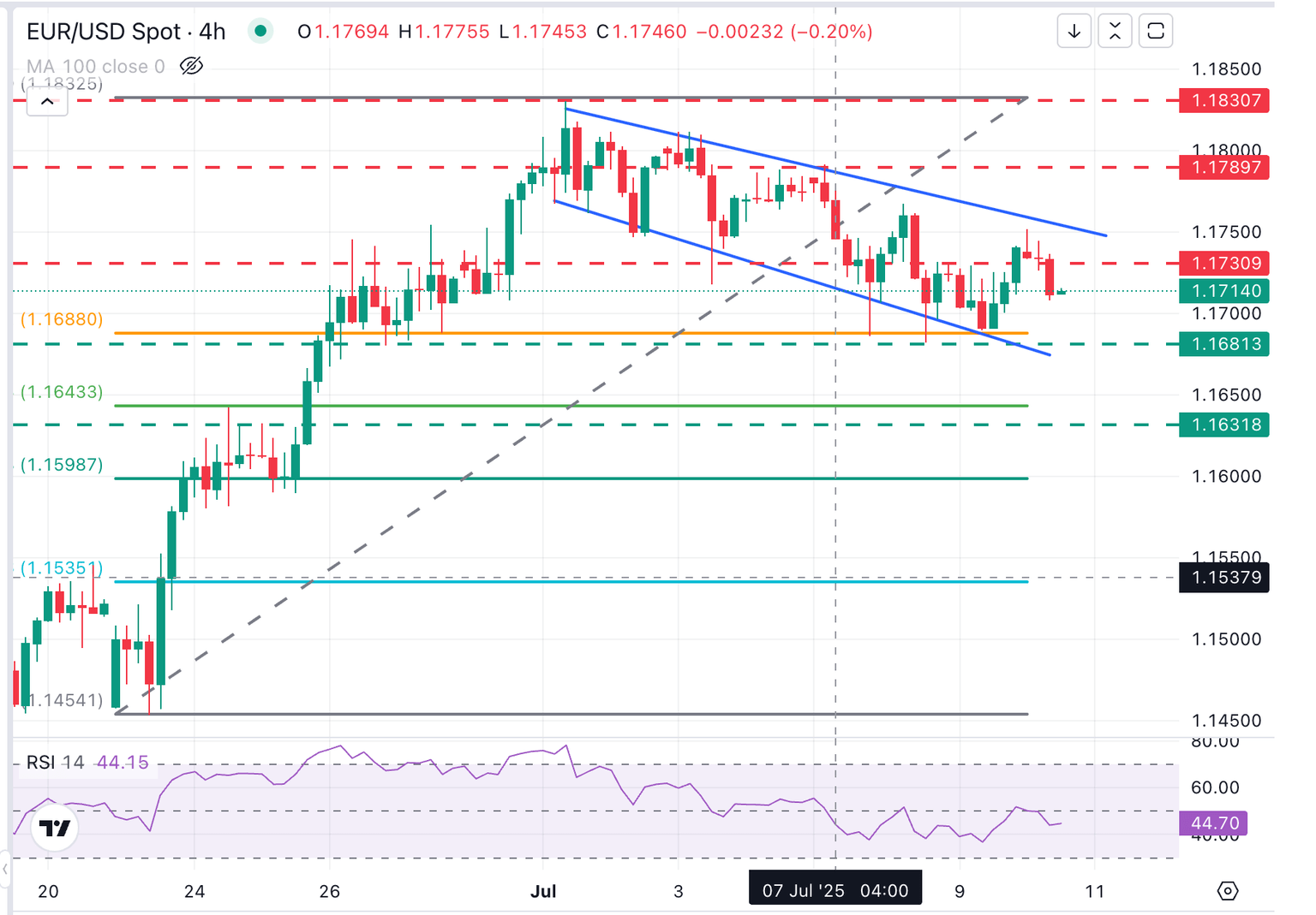 EUR/USD's upside attempts remain capped below the descending trendline resistance from July 1 highs, now at the 1.1760 area. This keeps the price action trapped within a broadening wedge pattern, a figure that reflects an emotional market and that often appears at major tops.