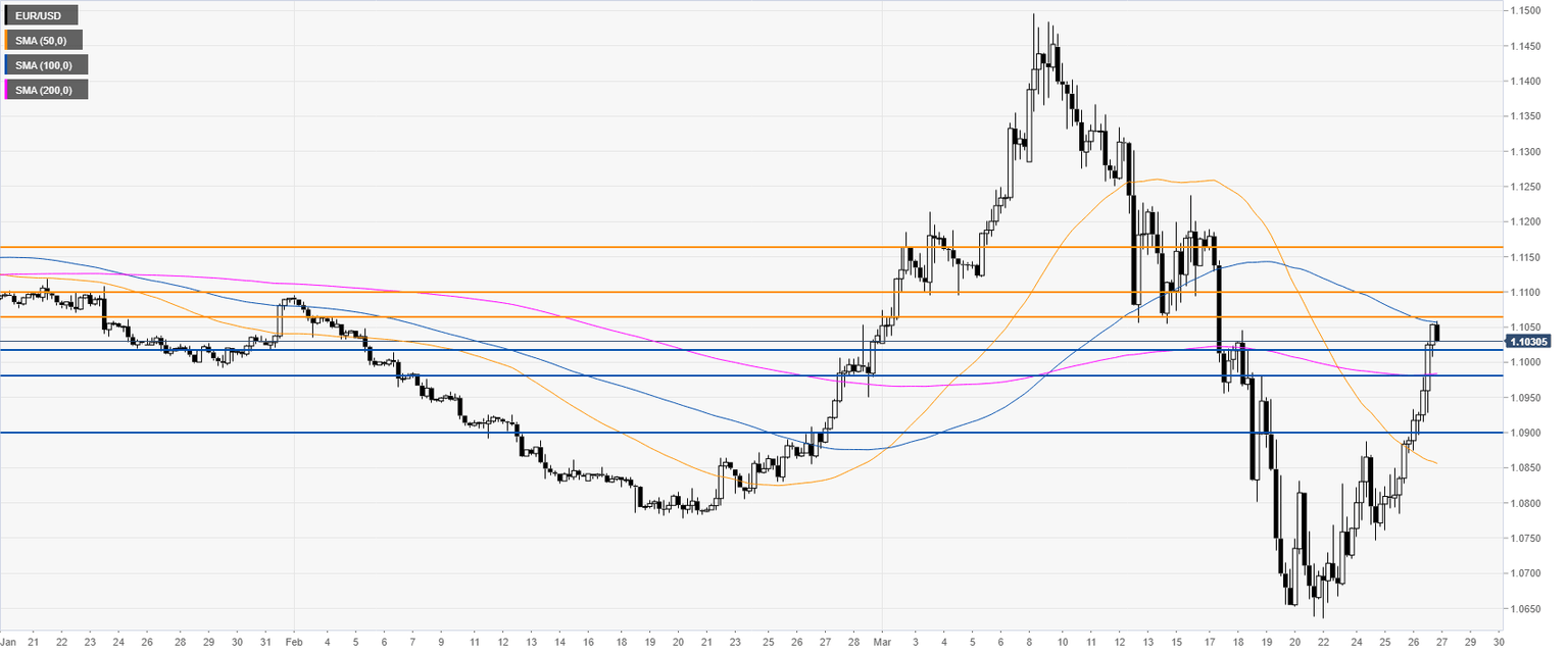 - EUR/USD retracement up challenges the 1.1060 resistance and the 100 SMA on the four-hour chart.