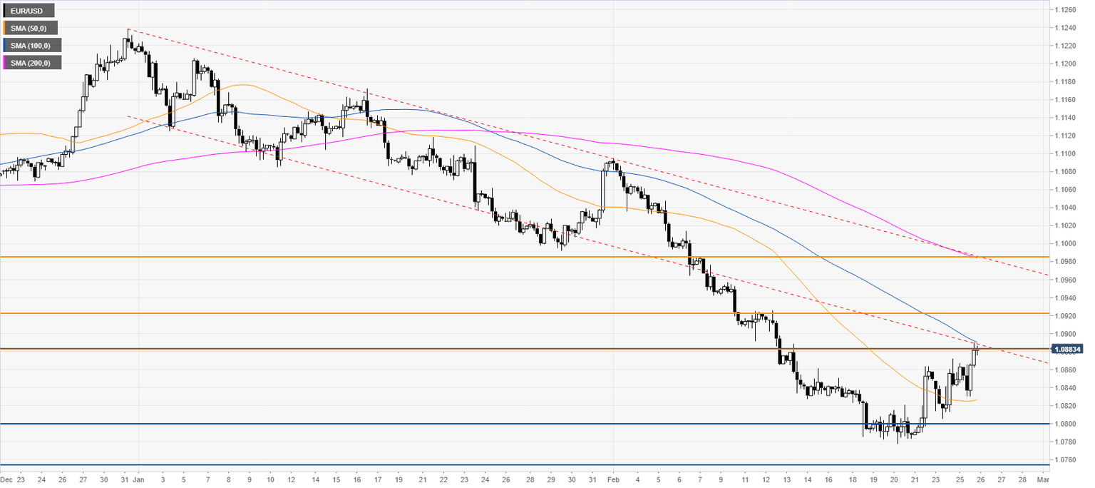 EUR/USD is trading in a downtrend below its main daily simple moving averages (SMAs) as the quote is correcting up from 34-month lows. EUR/USD is also challenging the 2019 low at the 1.0879 level.
